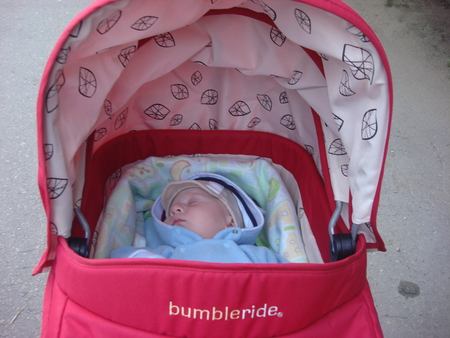 2)Сегодня я решила испытать прогулочный блок.Ну возраст нам пока не позволяет испытать по полному,поэтому как и вчера сынок просто лежал как в люльке,ну и естественно уснул через пару минут после выхода на улицу.Любит он в коляске поспать и по моему ему все-равно какая это коляска ))))