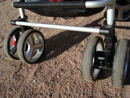 Для каждого колеса отдельный тормоз, но даже если зафиксировать два колеса, коляска отлично стоит.