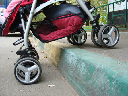 3. Ручка управления довольно длинная, и не жесткая. Когда пытаешься поднять передние колеса на бордюр, она сначала сама прогибается, оторвать перед от земли достаточно трудно, но как только она отрывается от земли, дальше очень легко, но если учесть, что выгнутая ручка управления выпрямляется, получается своеобразный толчок, у меня ребенок первый раз выскочил бы наружу, если бы не ремень безопасности )