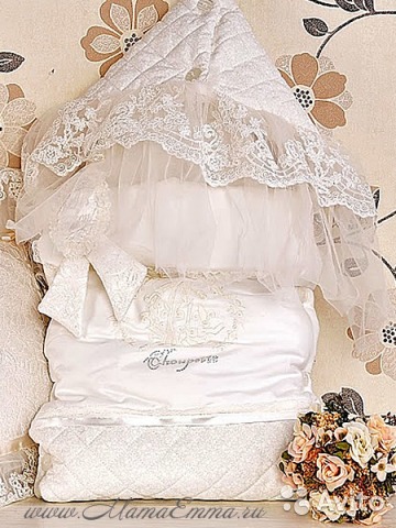 Продам роскошный конверт на выписку фирмы "Choupette" из хлопка с украшениями кружевом, стразами и шавроном. 3500 руб