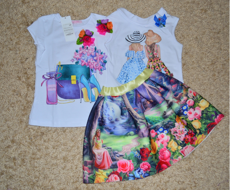 Новый комплект фирмы Stilnyashka: 2 топа, один со съемной брошью, юбка+ 2 броши. на рост 128-134-140. 2500р. г.Саранск почта