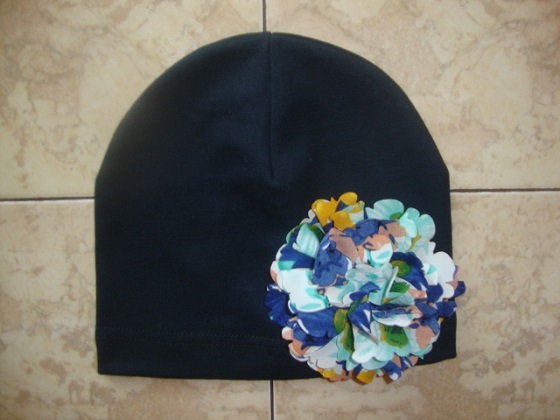 в) НОВАЯ темно-синяя трикотажная шапочка с ярким, разноцветным цветком совершенно НОВАЯ (наш перехап).Покупала ее в "Аэробусе".Цена-400р.