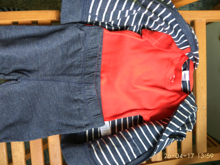 Комплект из трёх предметов, кофта с капюшоном, боди с коротким рукавом и штанишки на резинке и внизу тоже на резинка. Состав 100% хлопок. Размер 18 месяцев на рост 78-83 см. Фирма Carters, США. Подойдёт как для мальчика так и на девочку. Замеры: кофта - длина рукава от плеча 30 см, ПОГ 30 см, длина по спинке 33 см; боди - длина по спинке 46 см, ПОГ 25 см; штанишки - ПОТ 23 СМ, шаговый 28 см, общая длина по боковому шву 45 см. Цена 1200 руб.![]()