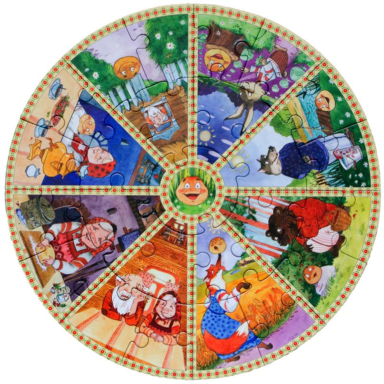 В-четвертых, сказзлы подходят как для индивидуальных, так и для групповых занятий с детьми (если у вас несколько детей или для детских садов). Каждый ребенок может собрать свой сектор-иллюстрацию, а затем соединить их в одну картину. После каждый расскажет свою часть сказки.