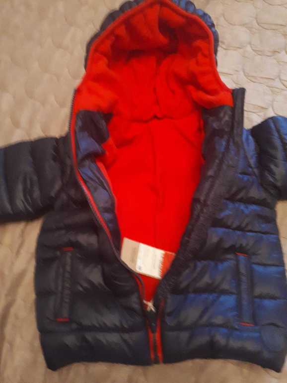 Темно-синяя, с красной подкладкой - флис по телу, рукава нейлон. Капюшон не отстегивается. Длина по спинке 37, рукав от подмышки 25, ширина 37. Куплена зимой на распродаже в mother care. 1400 руб. Москва, Коломенская.