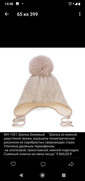 Шапочки, повязкиШапка из нежной шерстяной пряжи, украшена геометрическим рисунком из серебристых сверкающих страз. Утеплена двойным термофином на хлопковой, трикотажной, нежной подкладке. Съемный помпон из меха песца.состав 40% шерсть, 35% вискоза, 10% полиамид, 10% кашемир, 5% ангора. Покупала за 4500р. срочно пристраиваю, т.к. не подошел по цвету цена 3000р. почта