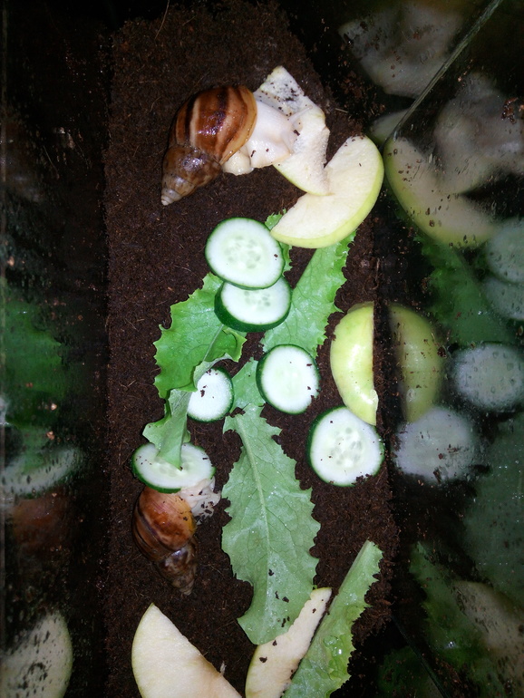 Свекру на работе подкинули контейнер с парой ахатин (вроде). В первый же день одна сдохла, вторую сегодня привезли домой.