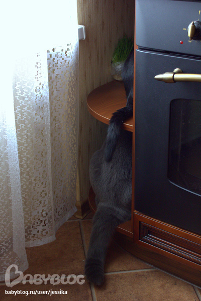 А это уже так было. Я не знала под что приспособить эти полки. Они рядом с духовкой и открыты. Мотя сам туда полез - вот и сделали ему там миску. Сверху стоял корм и вазы. А когда у нас появилась Багира, то и верхнюю полку освободили для неё.