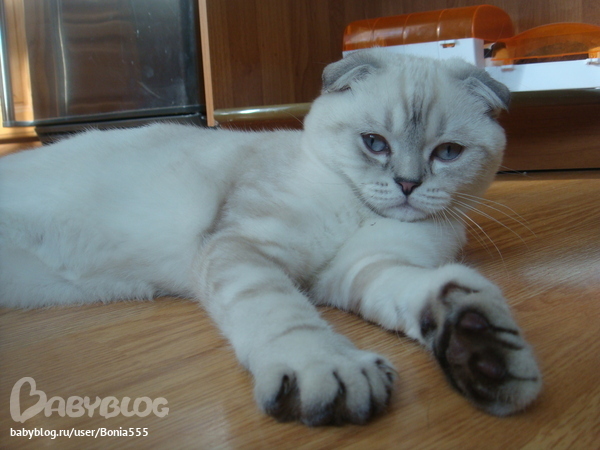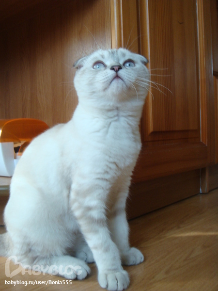 У нас окрас - шоколадный линкс-поинт. Сейчас действительно цвет стал проявляться на спинке, на ногах. Раньше совсем беленький был. А у вашего глаза тоже голубые? Я почеме-то не видела нигде шотландцев с голубыми глазами)