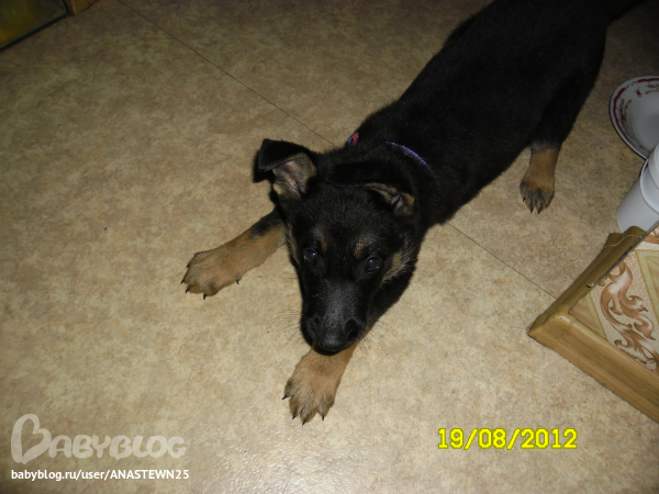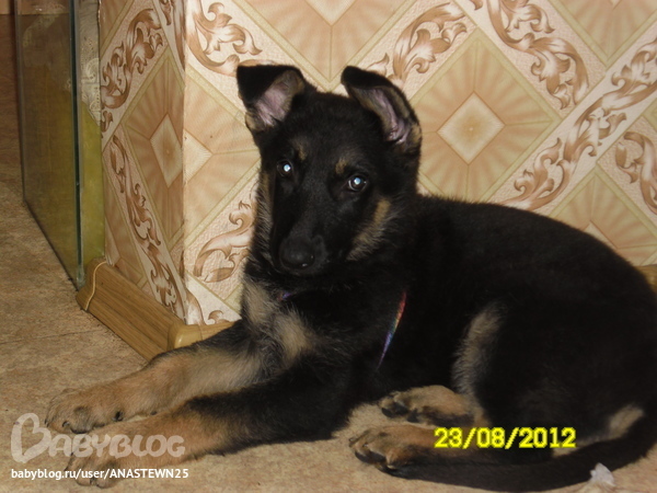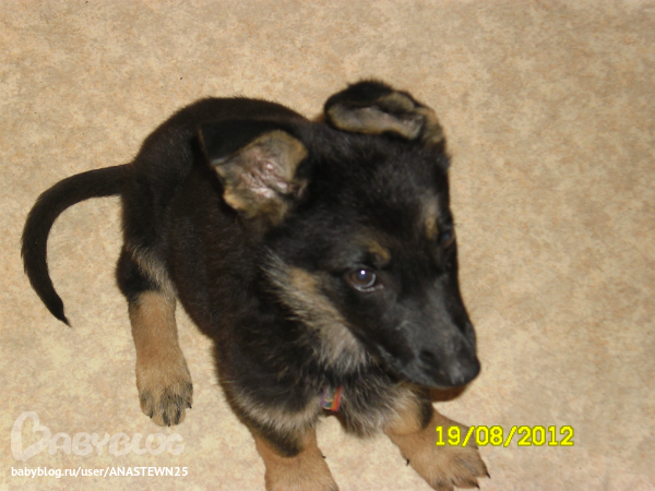 у Герточки уже встают ушки и мы уже знаем команды, сидеть, стоять, лежать, дай лапу люблю её очень, нам полтора месяца