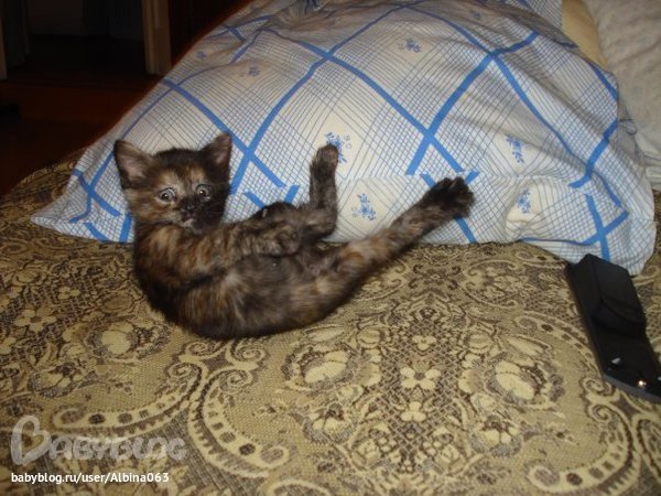 У меня первая кошка была яркая черепашка, за счет светлых пятен смотрелась контрастно. А у вашей на этих фото такая оттеночная шерстка, шоколадный перелив очень симпатично. Прям хочется пожамкать. :)