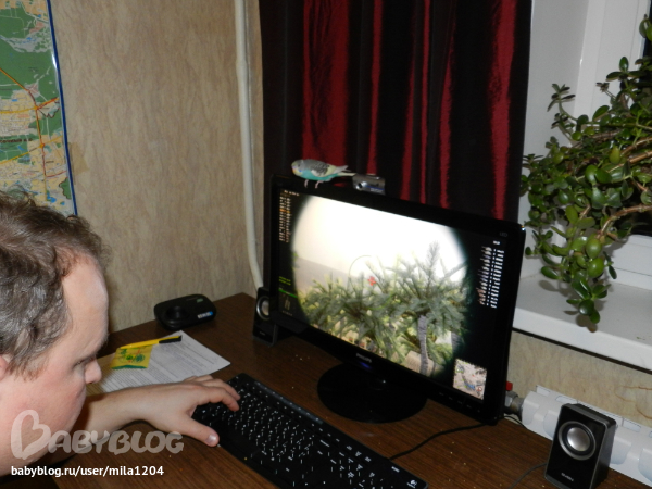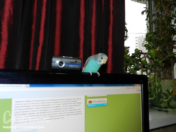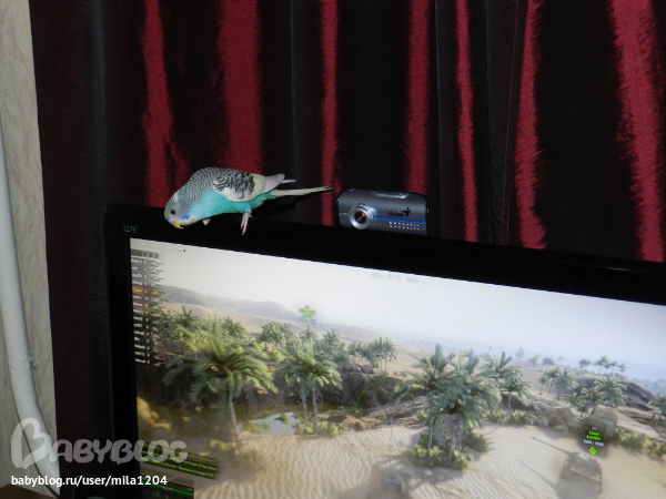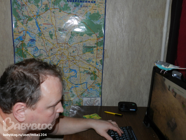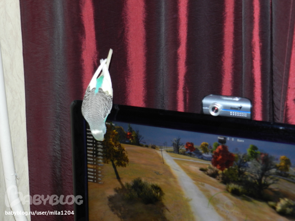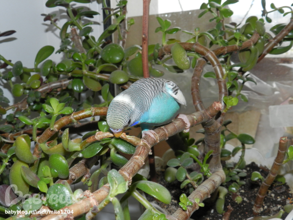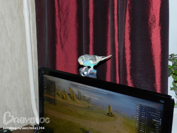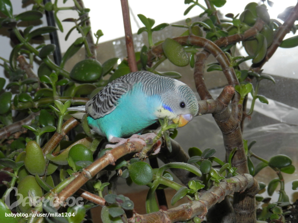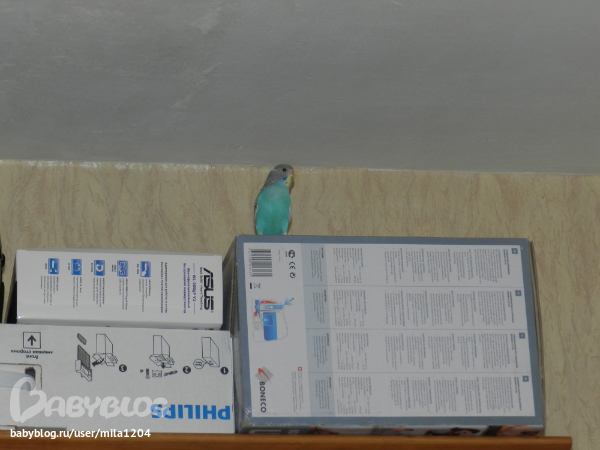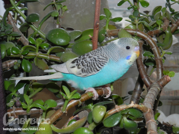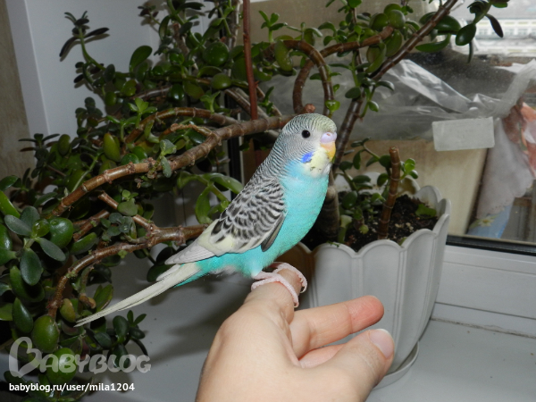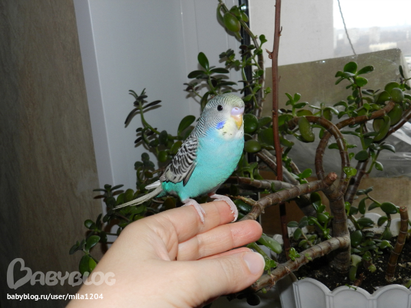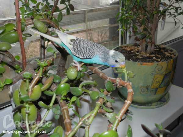 Алена ему уже заранее придумала кличку - Гиппи. Уж не знаю где она такое услышала но оригинально, правда?! Первые 2 дня видно у него был стресс, сидел на жердочке в клетке почти не двигаясь,но правда не шарахался клевал корм с руки. На третий день начал активно обследовать клетку, бегал по стенам и по крыше)) Дядечка сказал его из клетки не выпускать 2 недели, но разве у нас такое возможно?)) Алена его выпустила на 3 день. Он обрадовался, полетал по комнате и облюбовал себе денежное дерево на подоконнике и коробки на шкафу. Да, нас не обманули попугайчик уже ручной. Садится на руки, плечи, ест с рук частенько. Еще очень любопытный, когда муж садится за компьютер в "танки" играть он приземляется на монитор или вэб-камеру и наблюдает за ним еще и голову наклоняет вниз посмотреть, что там происходит)) Вобщем как то незаметно и я его полюбила, забавный он такой, когда на моя руку садится я ему ласковые слова говорю а он подчирикивает мне в ответ, видно нравится ему общение))