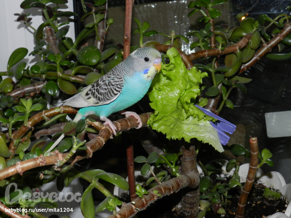 Думаю, может ему зелени не хватает?! Нашла выход, прицепила на прищепке лист салата...Ест