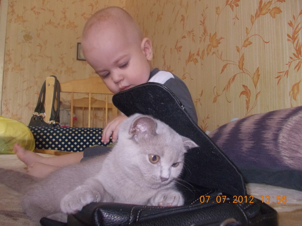 Наша Принцесса постоянно с сыном,это банда. Терпит даже когда он тащит ее за хвост, сын может взять и лечь на кошку, я еле успеваю его снять, она дурочка даже не шелохнется. Бегают друг за другом, прячутся, очень весело за ними наблюдать. Одно время она спала с ним, но сейчас Максим стал ворочаться по всей кровати вдоль и поперек, поэтому кошка вернулась в свою постель. Днем он спит на диване, а она в его кровати, переучить нереально. Я очень рада, что она у нас есть!  Тут сыну год, кошке полгода, начало дружбы)) надо наделать их совместных фото, что-то нашлось всего парочку...