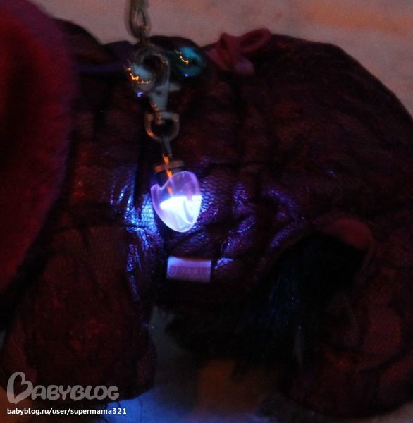 Так как на улице темнее рано, и даже на поводке не для всех наш гигант заметен, повесила на шлейку спец. мигающий брелок. А потом ещё и бубенчики. Теперь я и спиной чувствую что она идёт следом. :)