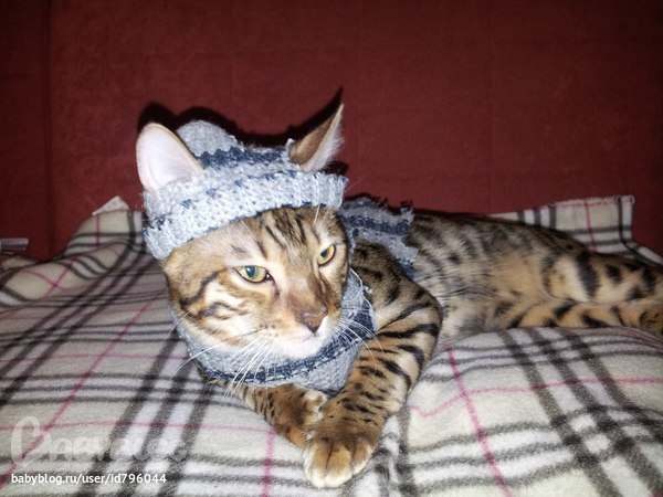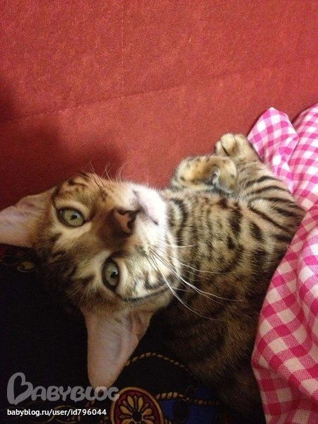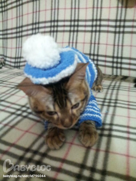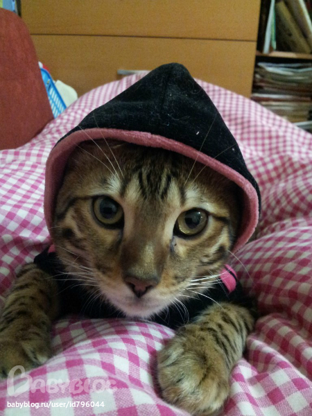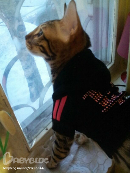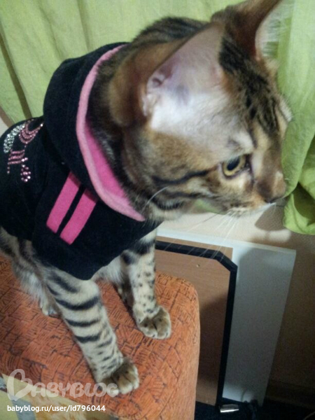 Это мой бенгальский котенок..Его зовут Карлос Бю Раторс...А по простому- Карбюратор.Ему очень нравится ходить в одежде..