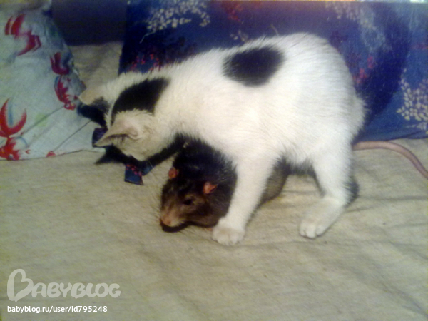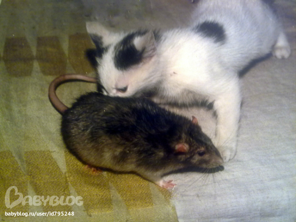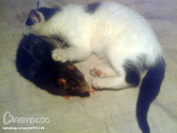 Забавные и милыеЖили у нас кошечка Тиу и крыс Гришка. Двое старших котов с Тиу не играли и она подружилась с Гришкой. Как они играли! К сожалению, крысы долго не живут. Вот остались такие фотографии.