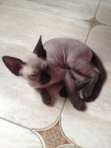 а сколько ей сейчас? что кушает?мы на РК для сфинксов,но он с года,"до" кормили и советовала(как и мне когда то заводчица) своим котятам РК 34,потом 36 для котят,плюс витамины нельзя давать,а то они все для росла волос,брашки и велюры могут заволосеть,после года витамины или по назначению вета!прививки в 2 мес,затем в 3 мес,потом в год,за 2 нед дать глистагонку) а мыться они любят очень)я детской шампунькой мою