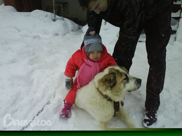 Дети и животныеУ нас частный дом- и мы завели себе собаку-Алабай(среднеазиатская овчарка), когда я родила я думала собака будет ревновать, но как оказалось,собака души не чает в ребенке-она всегда ей дается гладить,ложиться перед ней на спину,т.к Дайше(собака) больше дочки раза в три)) В общем они нашли общий язык,а еще мы вот так проводим время- Дайше может покатать дочку на себе)))