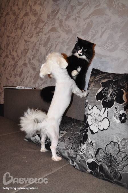 весело Вам) У нас кошаку 5,5 лет, и собаке годик. Кот конечно очень умный и воспитанный, считает правда что он хозяин)))