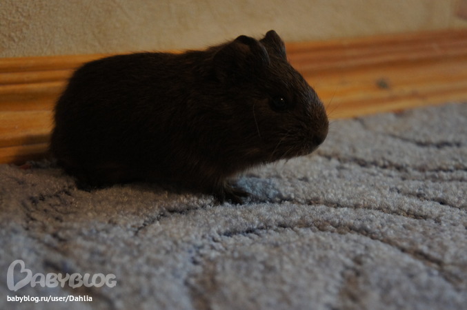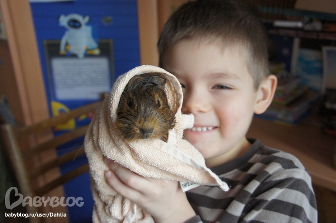4 октября прошлого года мы подвозили моих родителей к дому, припарковались около небольшого газона, вылезая на который мой папа увидел в пожухлой траве, копашашееся сушество, которое шёрсткой сливалось с опилками в перемешку с землёй и травой на которой он сидел. При первом осмотре было не понятно кто это, папа сначала решил что это маленький крысёнок (но длинный голый хвост обнаружен не был), Арсений, сразу же выскочивший из машины, деловито заявил, что это конечно же хомяк (но как примерно выглядят хомяки я видела на картинках в книжке) этот вариант был тоже отметён. И тут мне в голову пришло, что возможно, это есть маленький морской поросёнок. Высказав своё предположение в слух, Арсений стал вокруг меня скакать и кричать: "Мамочка, давай возьмём свинку! Я ОБЕЩАЮ, буду всё за ним убирать, кормить и поить." Ну ребёнок всё-таки просит и обещает проявлять какую-то самостоятельность в заботе о животном, и мне уже очень хотелось пригреть малыша. К слову сказать, я никогда не увлекалась грызунами, не представляла как такого питомца надо брыть что б не укусил, и уже тем более чем кормить и поить, но подумав, решила что знание- не проблема в современном обществе с интернетом.