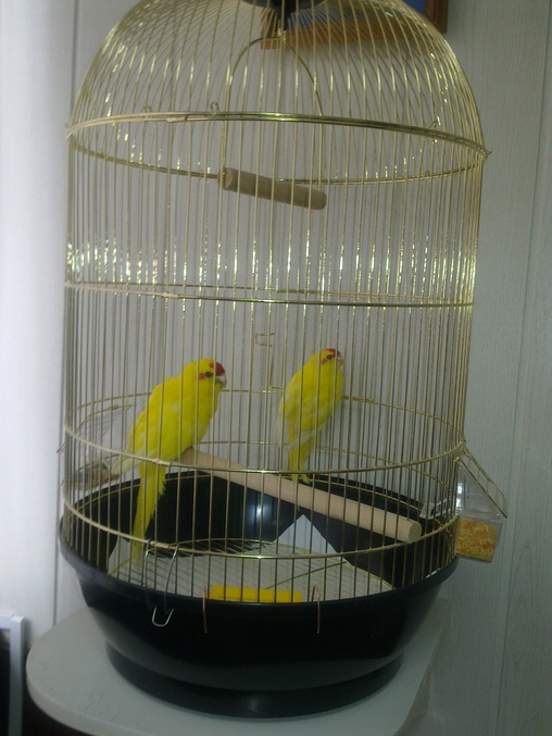 Знакомтесь: Яша и Ксюша, имена подобрали здесь, на ББ, спасибо. Все, вроде, не плохо, привыкаем друг к другу, уже дружим, по утрам, когда всё подъеденно подчистую - едят семечки из моей ладошки. Вопрос, как выгулиать этих птиц и надо ли? Вечером закрыла на ключ кабинет, выпустила Ксюшу, она взлетела и с перепугу ляпнулась в стенку и плюхнулась в кресло, посадила ее назад в клетку, чтобы вообще не убилась. До этих были волнистики, болтали, по столам разгуливали, гуляли спокойно, но эти гораздо крупнее и тяжелее, вот, не знаю, как быть, ведь птицы должны летать.