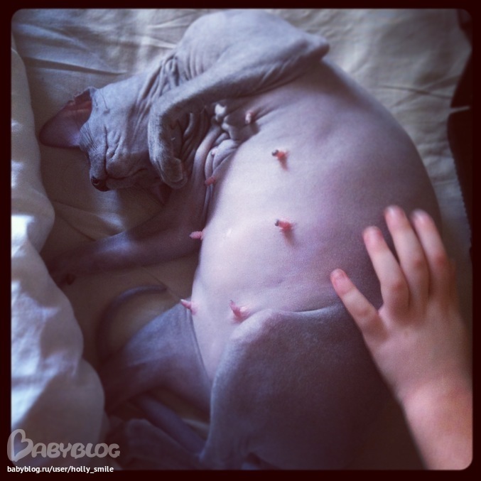 а здесь уже за 3 дня до родов,но все равно он не такой большой как получится на фото,муж все говорил что 1-2 котенка там))