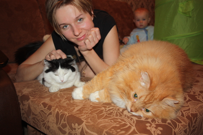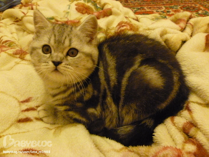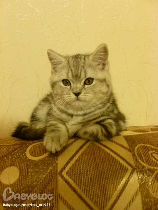Наши любимцы!Уже писала, что просили мы у папы Хаски! он тоже хотел. но пока решили отложить, не мучать собаку проживанием в квартире. обзаведемся домом и купим собаку. а пока наш папа подарил нам котика (24 февряля). был он против покупки, но все ж решился - подарок мне на предстоящий др. Теперь у нас новый член семьи - котик Скоттиш-страйт с документами. по метрике Тэрранс, а я зову его либо Тэрри, либо Плюшкин. котенку сейчас 2,5 месяца. сделали 1 прививку. котик не ручной, что характерно для этой породы - не сидит на руках, если сам не хочет. но только до него дотрагиваешься, сразу мурлычет. спит со мной, уткнувшись мордой в лицо. так щекотно от усов! очень игривый. к лотку приучен. ест отлично. Но очень боится нашего активного и громкоголосого сына. Семён его не обижает, гладит очень аккуратно, с животными умеет обращаться. просто Сёма каждый раз когда видит кота, визжит от радости. кот в первое время убегал и ложился спать в диван. сейчас кот освоился, сын его таскает. кот не в восторге, но не рячется уже. но в основном, кот отрывается, когда ребенок спит. до полночи скачет.