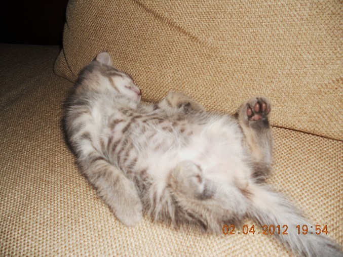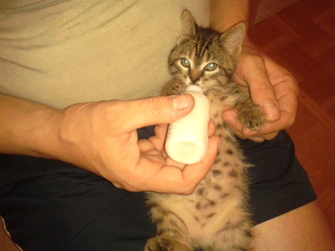 Подкинули на работу очень маленького подсосного котенка, который ночь-день орал от голода, хотя сердобольные женщины клали ему колбасу и наливали молоко. А она физически пока не могла это кушать. Наврав начальнику, что мне нужно к нотариусу, я схватило измученную кошь и помчалась домой. Дома был муж, приболел. Я ему ее под бок, а сама в магазин. По дороге забежала в вет.кабинет, девочка порекомендовала сливки. Так мы на сливках, причем только признавала "Кубанский молочник" и вымахала. Выросла озорная непоседа, хулиганка и любимица мужа. Пристраивала через Авито. Потом неделю рыдала по ночам....