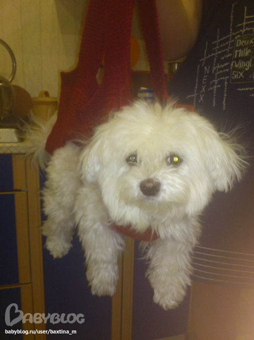 Забавные и милыеРжака пипец!! Мама связала нашей Томе сумку переноску))))))))))))))))))Собака в шоке конечно немного,она вольная у нас.. но привыкнет я думаю. Конечно мы редко наврено ей пользоватся будем,но иногда нужна.. руки свободны. Вязали наобум,без всяких схем,поэтому и нитки вязли самые обычные,просто чтобы попробовать ,если нам понравится то потом свяжет мама красивую