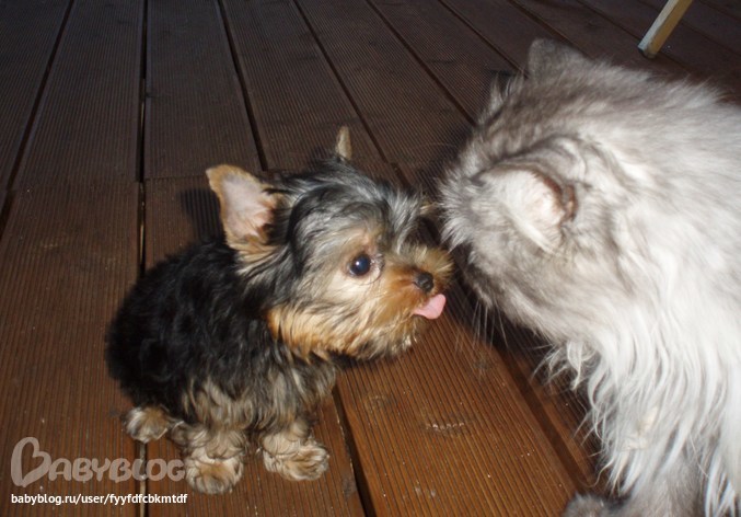А это он с котом знакомиться, Каспер самый старший из все животных, 9 летний ленивый "кастрат" так по началу переживал по поводу нового жильца, что у него голос пропал, рот открывает мяукать, а звука нет.