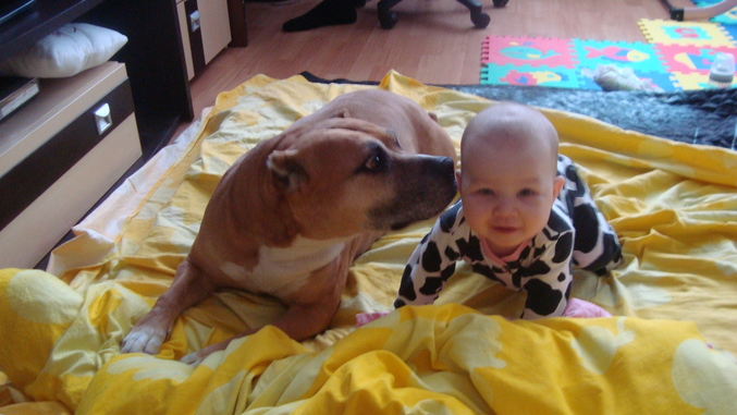 У нас стаффка 4 года, ребенку 6 месяцев, все ок, вместе ползают, он ее гладит и хохочет при виде ее))) она у него нянька, сидит около балкона и меня зовет если тот плакать начинаетна балконной прогулке)