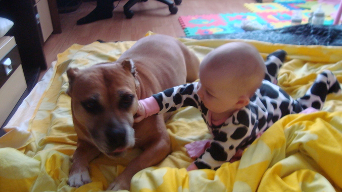 Дети и животныеУ меня дома стафф, девочка, 8 лет уже. Добрее собаки в жизни не встречала ))