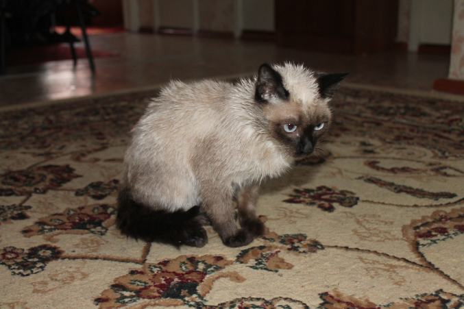 Породистый всего скорее что-то типо сиама. Возраст 6 мес ну не меньше 4 и не больше 6 это точно. Но я прям как увидела сразу подумала 6 мес коту. Кастирровать после прививок до того как загуляет. Спрей все эти фигня.