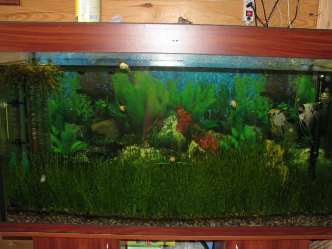 Здесь обитают скалярии, лабио, сомы и улитки)) были еще черные бомбовозы такие крупные, как будто с икрой на голове - забыла название(( почему-то померли((
