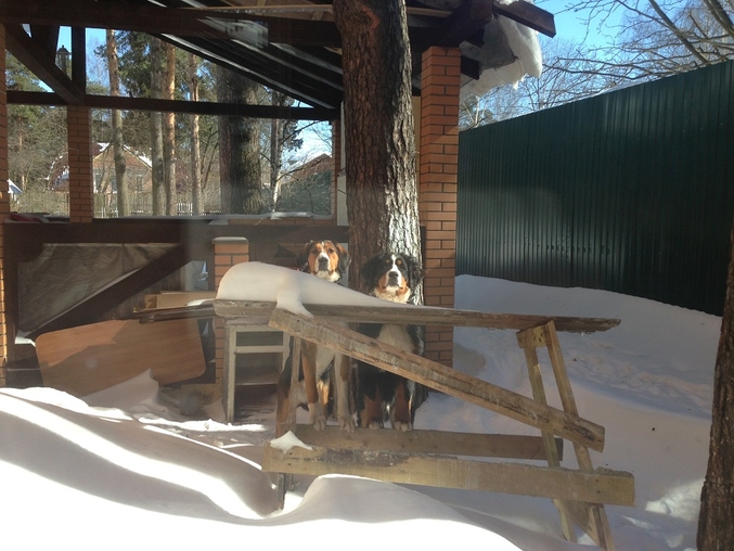 Отлично ладят. Мальчик и девочка. Мальчик чистый берн, девочка помесь берна с гончей.