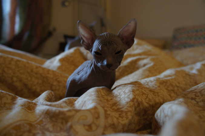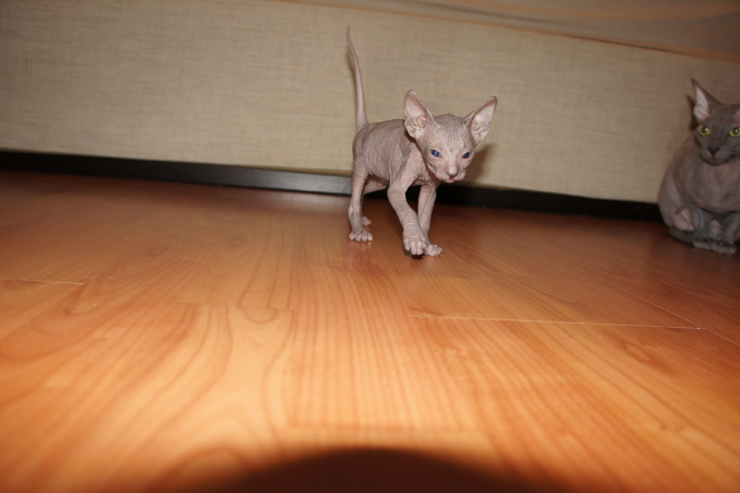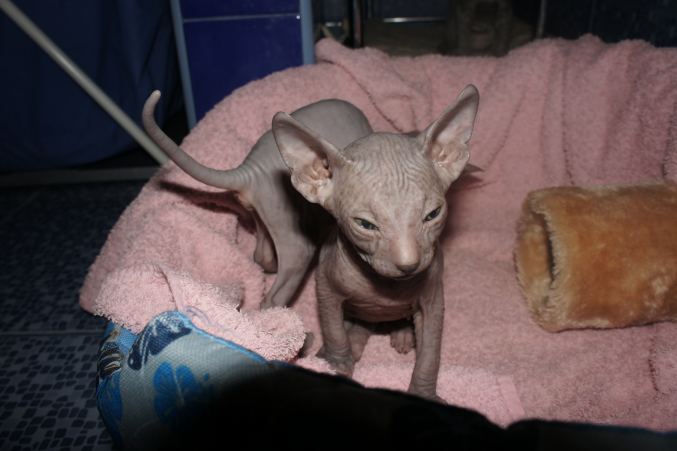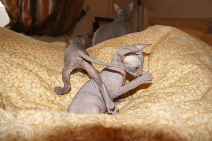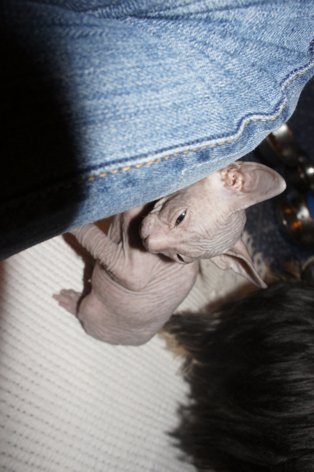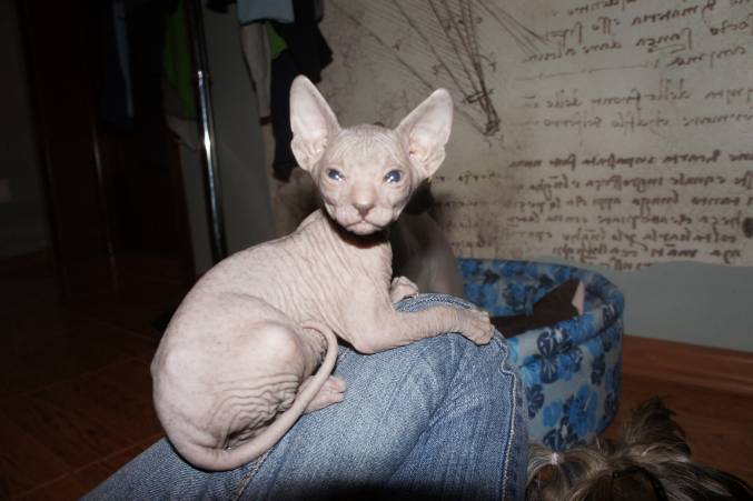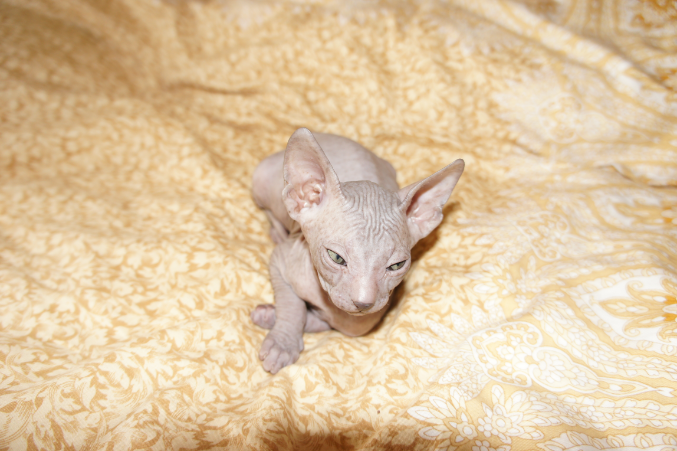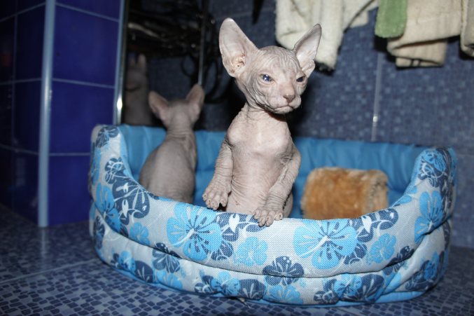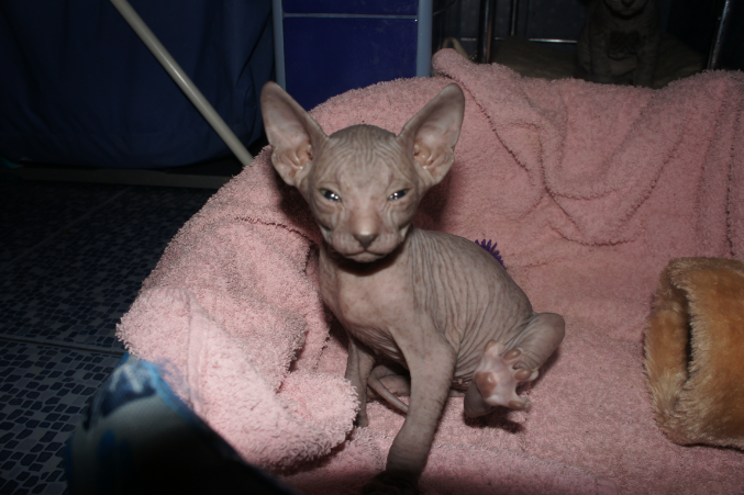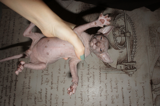 Окрас голубой(кажется шоколадно-телесным),полностью голый котик(резинка)