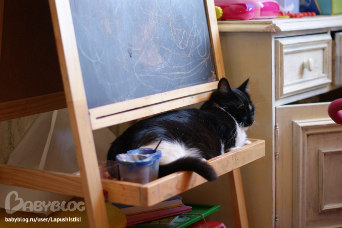 Теперь у нас новое место для сна - Алисин мольберт! И действительно, куда ж ему бедолаге ещё приткнутся)) Художник))