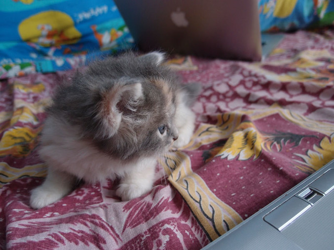 И мы решили с мужем, что ее оставляем, а 2 пробуем пристроить в добрые руки. Я ее приучила к еде, кормила с рук. Сейчас она уже ест самостоятельно, а до этого облизывала и играясь покусывала мне пальцы. Но сейчас такое чувство, что у котенка подростковый период. То она может полчаса лежать у меня на груди (это мы Евровидение смотрели), то вчера, например, целый вечер прыгала по дивану и начинала царапаться, когда я брала ее в руки.