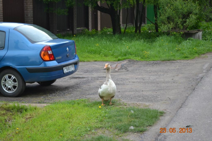 гагочет ТАК громко, что слышно на др стороне улицы. Сначала их было 3шт....сейчас гуляет только 1. видать сожрали)))