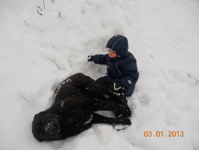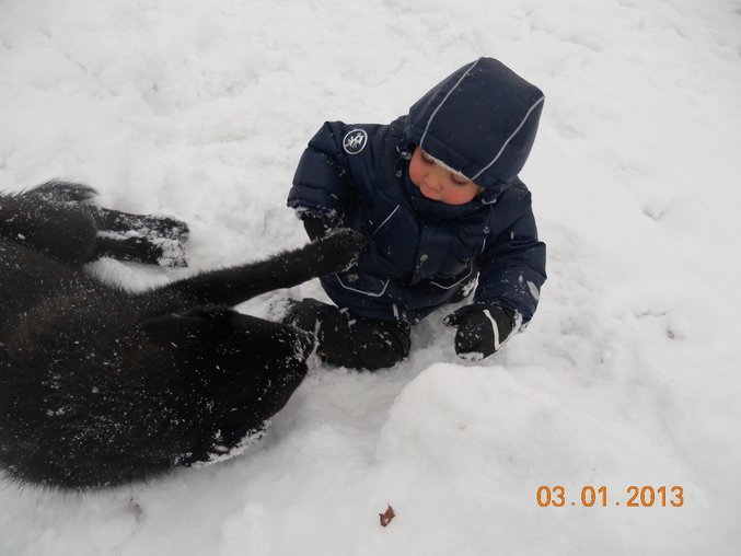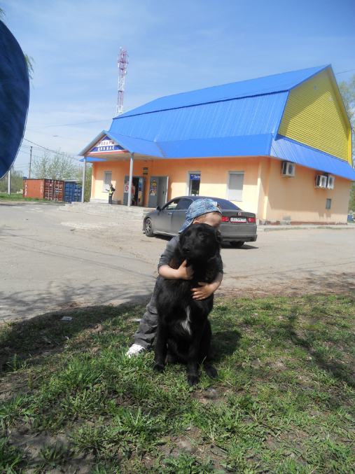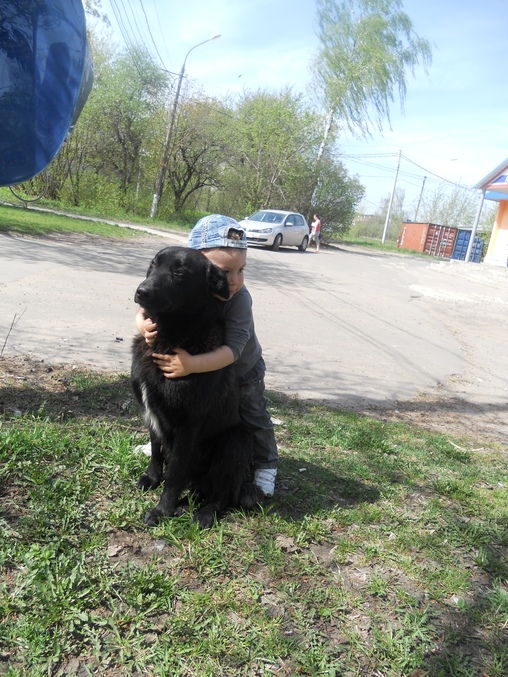 А теперь о главном.В конце осени прошлого года пришёл к нам в посёлок этот пёс.Худющий,лапа перебита,вобщем обнять и рыдать.Но очень добрый оказался и благодарный.Назвали Чернышом.Откармливаем почти всем посёлком.От детей терпит всё,мне кажется даже домашний пёс от хозяйского чада столько бы не вытерпел.Ну и дети в свою очередь души в нём не чаят.Для нашего так вообще наверное лучший друг))))))) Так как он всё время рядои с детьми,то я ему и прививки делаю и глистов травлю.А он наверное всё это понимает(как человек).Он по натуре своей трусоват,боится больших собак,но если они пытаюся к детской площадке подойти лаит,правда из далека.