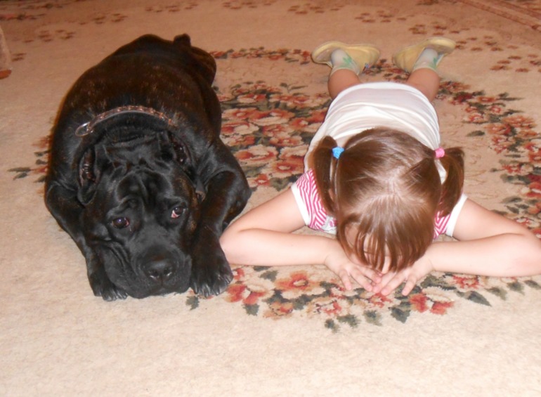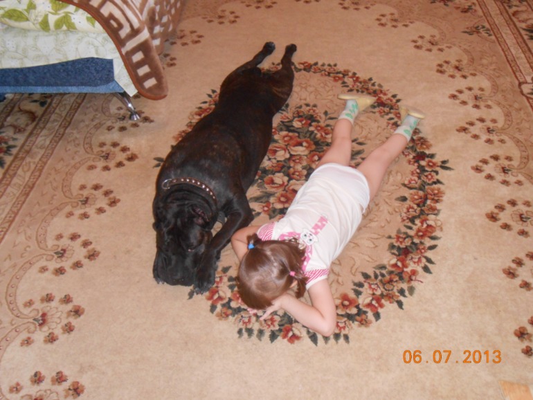 Алюнь, я не скажу что они прям такие подружки, у меня Вероника ровно к собаке относится. Правда иногда начинает ее то тренировать (ко мне, сидеть и лежать), то заваливаться на собаку сверху или вот так рядом. Самое интересное что Мафи спокойно лежать может только с Вероникой, если я с ней так рядом лягу - начинается бесиловка. Команды Никины она тоже выполняет все, на удивление )