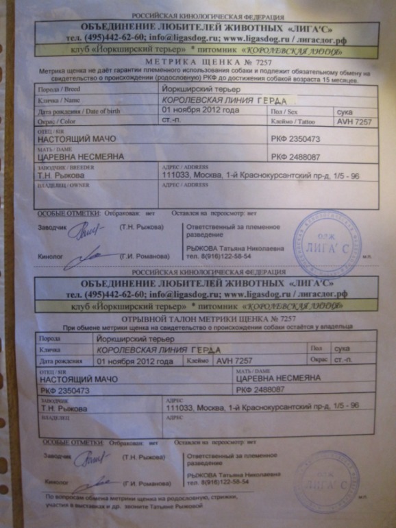 И ведь читала, что надо смотреть много щенков, щенков разных заводчиков, что надо посмотреть в каких условиях содержится собака. Читала, что на всё надо обращать внимание, на мелочи, на всё. Видела я объявление на авито, много-много просмотрела, конечно объявлений и запали мне в душу одни фотографии с одного объявления. Позвонила им, сказала, что меня интересует девочка стандартная. Она сказала, что у неё есть, я спросила возраст, говорит 2.5 месяца. Я спросила её ли щенки на фото в объявлении, тут она развозмущалась, говорит "я только свои фото выставляю, никогда чужие не трогаю". А я йорков-щенков никогда не видела и была уверена, что еду смотреть то, что на картинке было. А тут еще выяснилось, что она в Апрелевке живёт, совсем недалеко относительно от нас. Ну мы этим же вечером и поехали смотреть. Приехали, привела она нас в частный дом, один видно для людей, жилой, а второй типа бани. В "бане" живут собаки. Она нас в предбаннике посадила, там еще освещение было не самое лучшее, и щенка к нам вынесла. Я волновалась очень и всё насторожило меня лишь когда я обратно приехала. Щенок мне понравился очень (ну как кроха может не понравиться?), заводчица нам очень много рассказывала. Я спросила: "сколько ей сейчас?" Говорит два месяца. (нестыковку с телефонным разговором я поняла уже дома) .Потом я попросила маму посмотреть, она вынесла нам маму, говорит мама стандарт, ваша такая же будет. Мама красавица, а йорки лично на мой вкус, мне нравятся далеко не все. Показывала нам фото папы щенка. Об этой тёмной истории я уже писала ранее... разбираться-пачкаться я не стала. Спросила, почему так отличается щенок от щенков на фото, она говорит, что это от другого помёта щенки, они у неё сейчас тоже есть, просто они мини, предложила вынести показать, да я отказалась, зачем душу травить, если мы выбираем стандарта совершенно осознанно. Метрику её она мне показывала, да я не рассматривала сильно... Щенка мы купили. Уже дома заметила, что в метрике дата рождения 1 ноября, т.е. обманули меня дважды- сначала по телефону, сказали, что 2.5 месяца, потом при встрече, сказали, что 2 месяца. купили мы её 24 декабря. Т.е. ей и двух то не было. Ну ничего, купили так купили. Потом меня стали непонятки с папой щенка беспокоить, потому что в метрике был наш папа один написан, а при продаже она мне описывала, что папа супер-пупер кобель, лучший клубный заводчик (мне-то дуре и в голову не пришло задуматься почему нестыковка такая, в метрике одно имя, а описывает она другое совсем и папу называет другим именем). . С этой историей я разбираться не стала.... (ниже выложу фото метрики, согласно документам, собака от клуба, но купила я её совсем не там, где клуб находится. Еще один момент... Когда пришла домой с щенком, заметила, что там где в метрике имя собаки написано, после первой буквы белая полосочка наклеена и поверх черной ручкой написано другое имя. Я лист перевернула другой стороной , на свет посмотрела, Было Гремина, стало Герда. Я забила на это... Домашнее имя мы выбрали Лиза. Сейчас Лизе 8 месяцев и весит она уже 3400. Надеюсь, больше не вырастет. Какое-то длинное введение получилось... Потом я лоханулась и не раз.... В общем Собака родилась 1 ноября 2012 г.