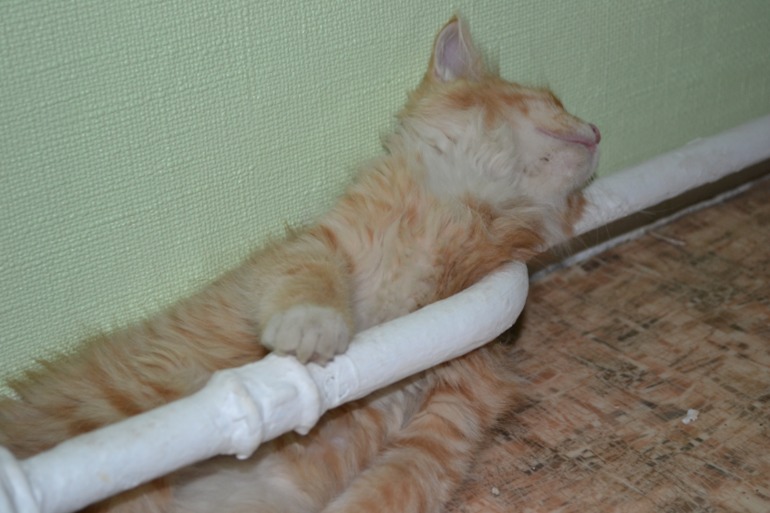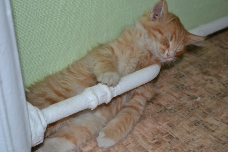 Наш теперь не спит там,подрос..он теперь спит на пакетах..стырит пакет,завалится на него и спит,порой залезает в пакет и там спит