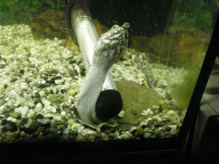 У нас тоже трионикс как спрячется, так гости потом спрашивают - а почему у вас пустой аквариум?)))Один раз ее застала в такой позе. Как поганка)))