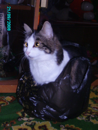 Все мои коты и кошки, которые жили и живут у нас, просто тащатся от зонта и пакетиков и сумок! Минька так просто встречает на пороге и первым делом лезет в сумку с инспекцией. А уж найденные пакеты всегда использует по назначениею - залезет и сидит там. Вдруг не заметим и вынесем на улицу! Хотя улицы боится до полуобморочного состояния! И зонтик тоже любит охранять, изображая копилочку под зонтиком.