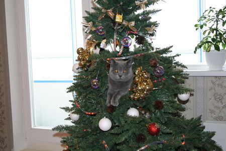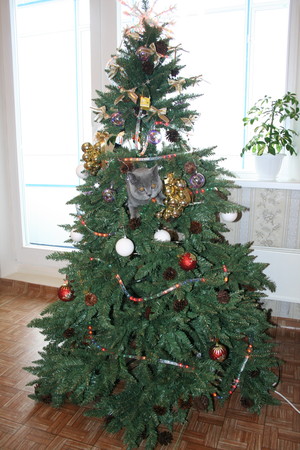 залазит вниз под ветки и по стволу на когтях забирается вверх пролазит между ветками и располагается на них...ёлка конечно вся ходуном от такого а ему нравится