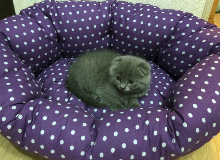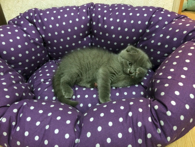 Принесла домой, дождалась пока выйдет из переноски, показала где спать, где есть, где в туалет ходить. Дома мы только 1,5 часа, а он уже попил и пошаркал в лотке ))) Ну и кровать нашел, именно там пошел валяться. А сейчас скачет по квартире, обнюхивает все.