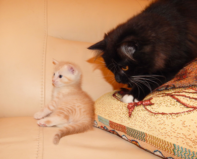 От него отказалась мама - кошка в офисе у свекрови. Первые два-три дня толком сам даже не умел кушать, кормила его из сосочки и с пальца детским мясным пюре. А сейчас уже во всю наворачивает овсяную кашку и мурчит, как трактор :) На горшок пошёл с первого раза, хотя долго копал и изучал его, нигде ни разу не сделал мимо! С чернышом Филькой пытается играть и иногда принимает его за маму, и хочет куда-нибудь присосаться :)