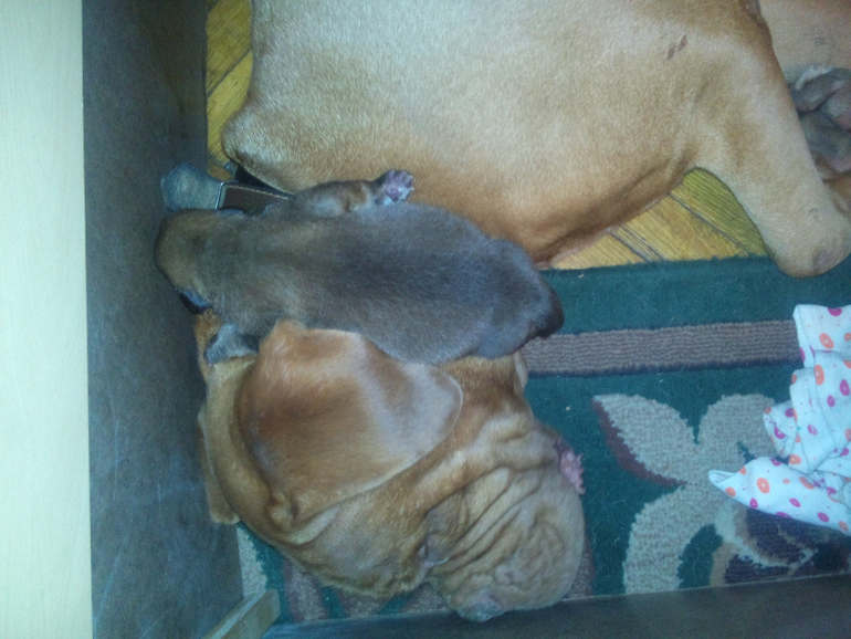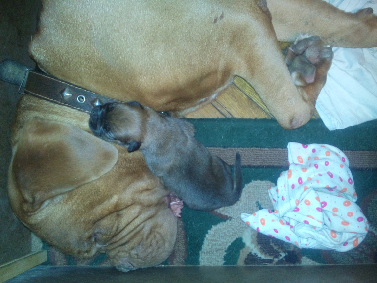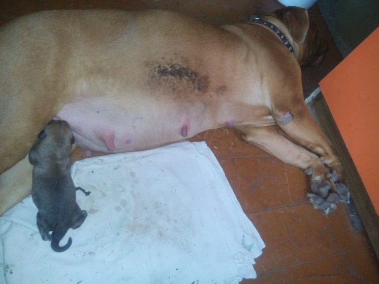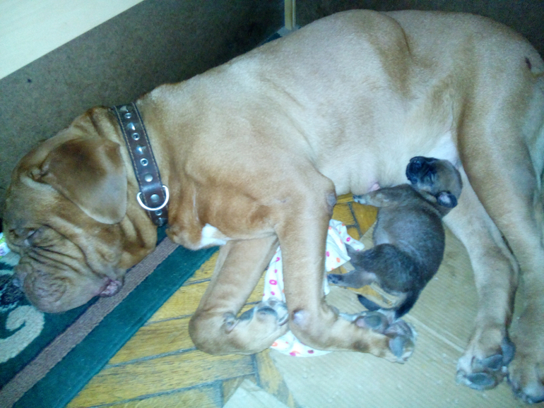 Наша бордосиха Марфа впервые стала матерью на старости лет. За последний месяц Марфа стала много есть,толстеть, стала ленивой, очень нежно относилась к Евгеше,позволяя делать с собой все, что угодно. Увеличились соски у собаки и мы решили, а ветеринар подтвердил по телефону, что это ложная щенность...